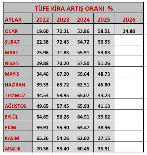 TÜİK tarafından açıklanan verilere göre 2025 yılı Aralık ayında yenilenecek konut ve iş yeri kiraları için 12 aylık TÜFE ortalaması esas alınarak belirlenen veriler doğrultusunda, Aralık ayında uygulanacak Kira Artış Oranı % 35,91 olarak gerçekleşti. |